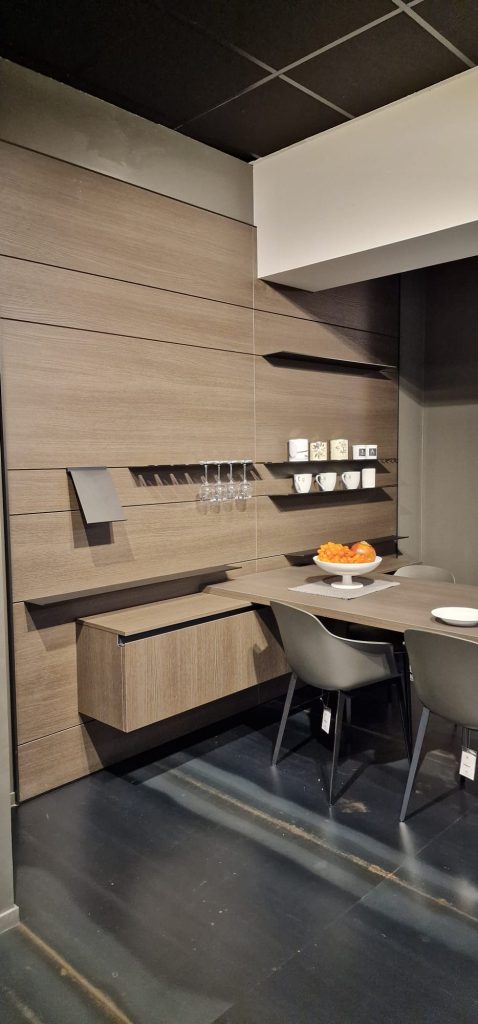 Frigorifero 400 lt; Forno 75 cm; Lavastoviglie integrata; Piano cottura a induzione; Cappa 550 mc/h; Schienale vetro temperato LED; Tavolo con boiserie; Mobile sospeso; Accessori in alluminio.